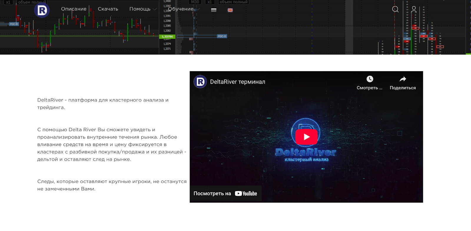 Платформа Дельта Ривер заявляет о выводе на экран внутренних течений рынка с разметкой покупок и продаж в кластерах, отображением дельты и рядом вспомогательных индикаторов. В интерфейсе присутствует ряд модулей для бэктеста, скринера и сигналов, а также встроенные инструменты для уведомлений и кастомизации. Продукт выглядит как специализированный терминал для тех, кто торгует по объемно-кластерной логике и хочет видеть следы крупных игроков прямо на графике.