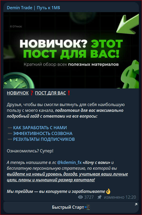 Уроки автора ориентированы на новичков и опытных инвесторов. Клиенты должны будут подписаться на закрытый телеграмм-канал и оплатить полную стоимость подписки. Цена зависит от выбранного пакета услуг. Например, за ₽8,250 в месяц клиенты получат доступ к базовой информации по трейдингу и торговым сигналам. При оплате максимальной суммы в ₽33,000 пользователи получают индивидуальную поддержку и полное обучение копитрейдингу.Автор проекта «Demin Trade. Путь к 1M» рассказывает о схемах и методах торговли цифровыми активами в личном чате. Таким образом он привлекает новых клиентов, желающих зарабатывать крупные финансовые средства.