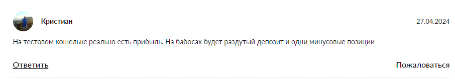 Другой пользователь в негативном отзыве заявляет, что на тестовом кошельке можно выйти в плюс и получить хорошие деньги. При переходе на торговлю настоящими деньги – одни минусы и убытки.