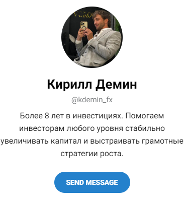 У инвестора есть телеграмм-канал с ником @KDemin_Fx, на котором он публикует новости и предложения по обучению инвестициям в копитрейдинг. Автор проекта заявляет, что продает, покупает крипту в течение 8 лет и всегда остается с прибылью. Он утверждает, что помогает клиентам выстраивать капитал без убытков, рассказывает о грамотных стратегиях роста в трейдинге.