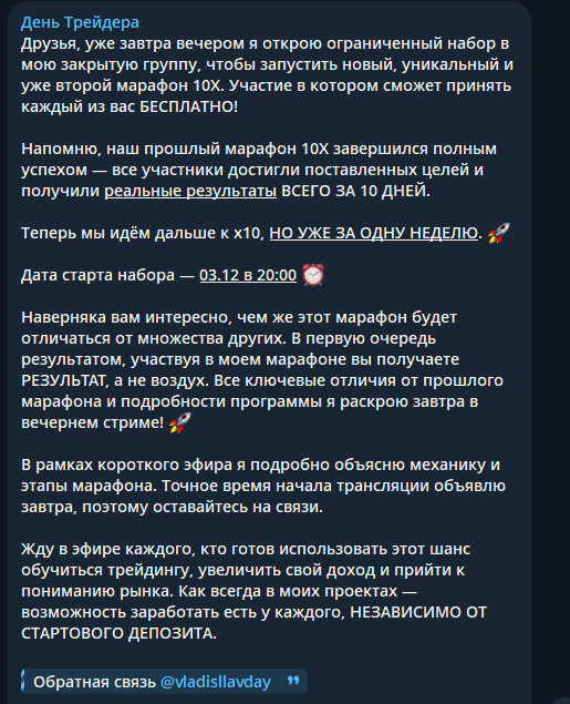 Также периодически ментор проводит набор в закрытые группы 10X, где проводятся 7-дневные и 10-дневные марафоны. По названию кажется, что в течение всего периода мы должны приумножить депозит в 10 раз, однако за такой период это просто невозможно. Трейдер явно обманывает или преувеличивает. Вход обещают бесплатный, но не уточняют условий: вероятно, необходима регистрация на криптобирже и депозит.