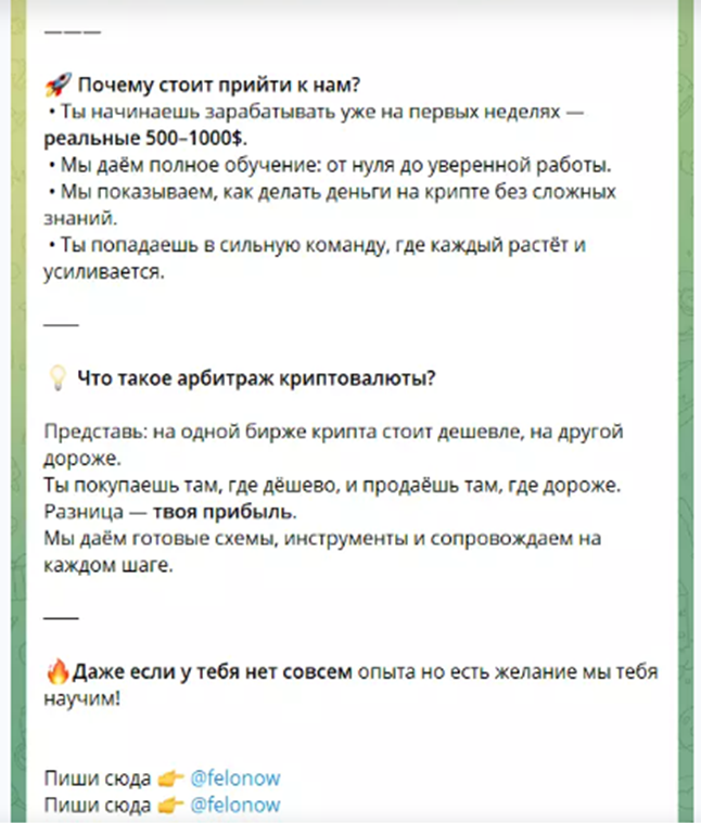 Мужчина утверждает, что прибыль можно получить уже с первых дней после вступления в его клуб. Он даст пошаговую стратегию и будет делиться прибыльными связками. Но подробностей о стоимости своих услуг он не сообщает. Под постом оставлен личный контакт для связи – Felonow. Нужно написать Дмитрию, после чего он в обратном сообщении даст все подробности.Но видимо, что-то с проектом Фелонова пошло не так, или же наш герой обычный аферист. Так как уже в декабре, меньше чем через месяц после запуска, канал был удален из Телеграма. Судя по всему, его владелец использовал типичную схему развода – давал фальшивые площадки для обмена. Такие фальшивые обменники лишь воруют деньги пользователей, при попытке продать или купить на них крипту средства уходят только в одну сторону.
