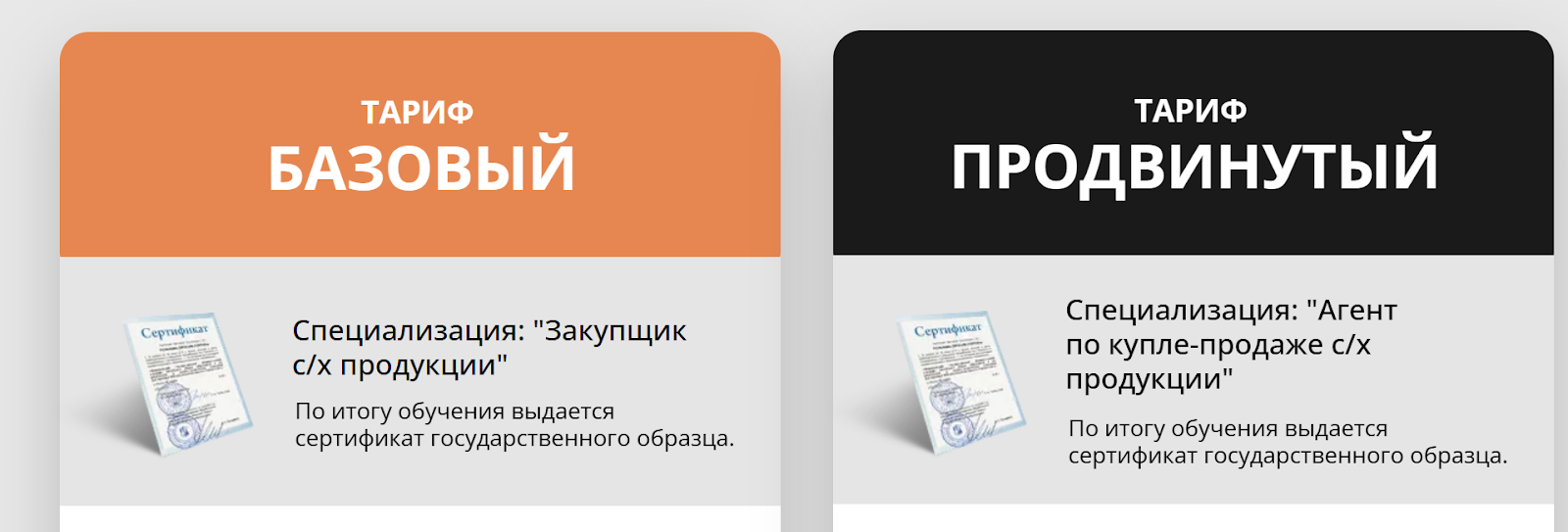 - Базовый. Предусматривает рассмотрение принципов закупки с/х продукции. Автор рассказывает о зерновом рынке России и виде с/х культур. Захватывается тема торговли зерном и поиска поставщиков. Изучается вопрос логистики, оценка стоимости сделки и другие вопросы. Цена обучения — 49,9 тыс. рублей.