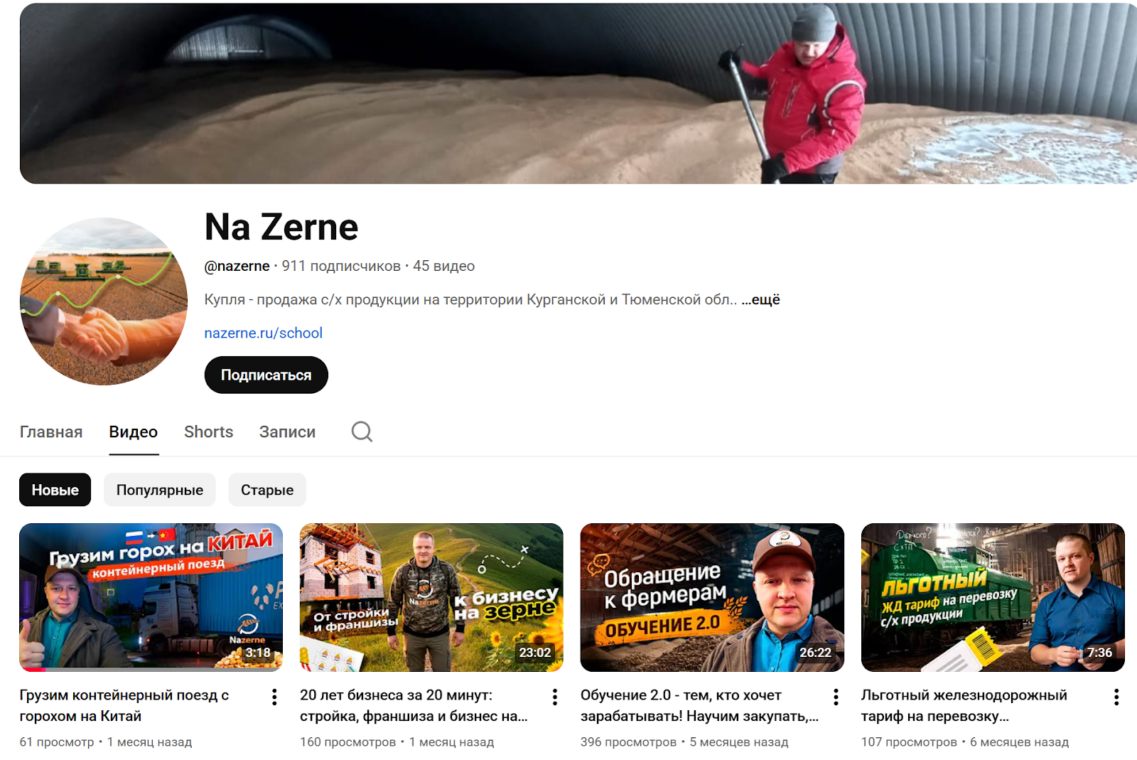 Для привлечения внимания к деятельности герой обзора ведет Ютуб-канал Nazerne. На октябрь 2025-го к нему подписано около 1000 человек. Количество размещенных видео — 45. В описании автор говорит, что занимается продажей сельскохозяйственных товаров в Тюменской и Курганской областях. Здесь же он рекламирует сайт и приводит почту nazern ru yandex ru для связи.