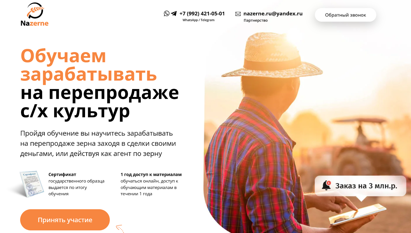 О Nazerne Ru отзывы в большей части позитивные. Клиенты хвалят оригинальную подачу информации и возможность больше узнать о продаже зерна. При этом автор активно продвигает курсы, ведет каналы в Телеграмме и Ютубе. В них он рассказывает о возможности заработать на перепродаже с/х культур и делится рядом полезных секретов. Ниже рассмотрим, что представляет собой такое обучение, и стоит ли на него тратить время.
