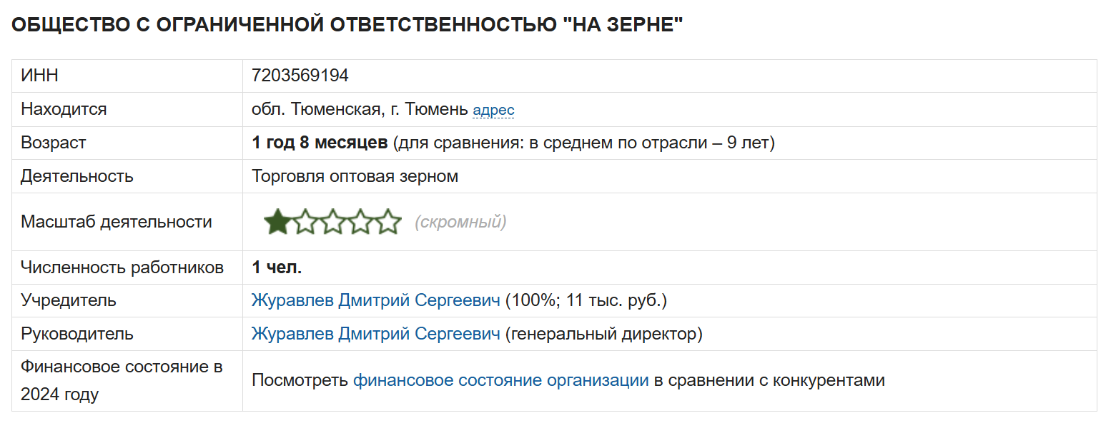Проверка компании показала, что она действительно существует. Фирма работает 1 год 8 месяцев и ориентирована на оптовую торговлю зерном. Единственным сотрудником является сам Журавлев Дмитрий Сергеевич. Он же является учредителем компании с уставным капиталом 11 тыс. рублей.
