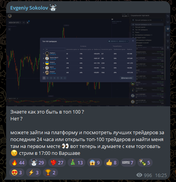 Evgeniy Sokolov Телеграм – трейдер, предлагающий доход на копировании сделок. Ведет собственный блог с бесплатной информацией, предлагает вступление в VIP клуб. Зарабатывает на опционах, приглашает потенциальных клиентов вступить в команду для совместных сессий. Но успешность Евгения вызывает сомнения, подписчики негативно отзываются о его профессионализме.