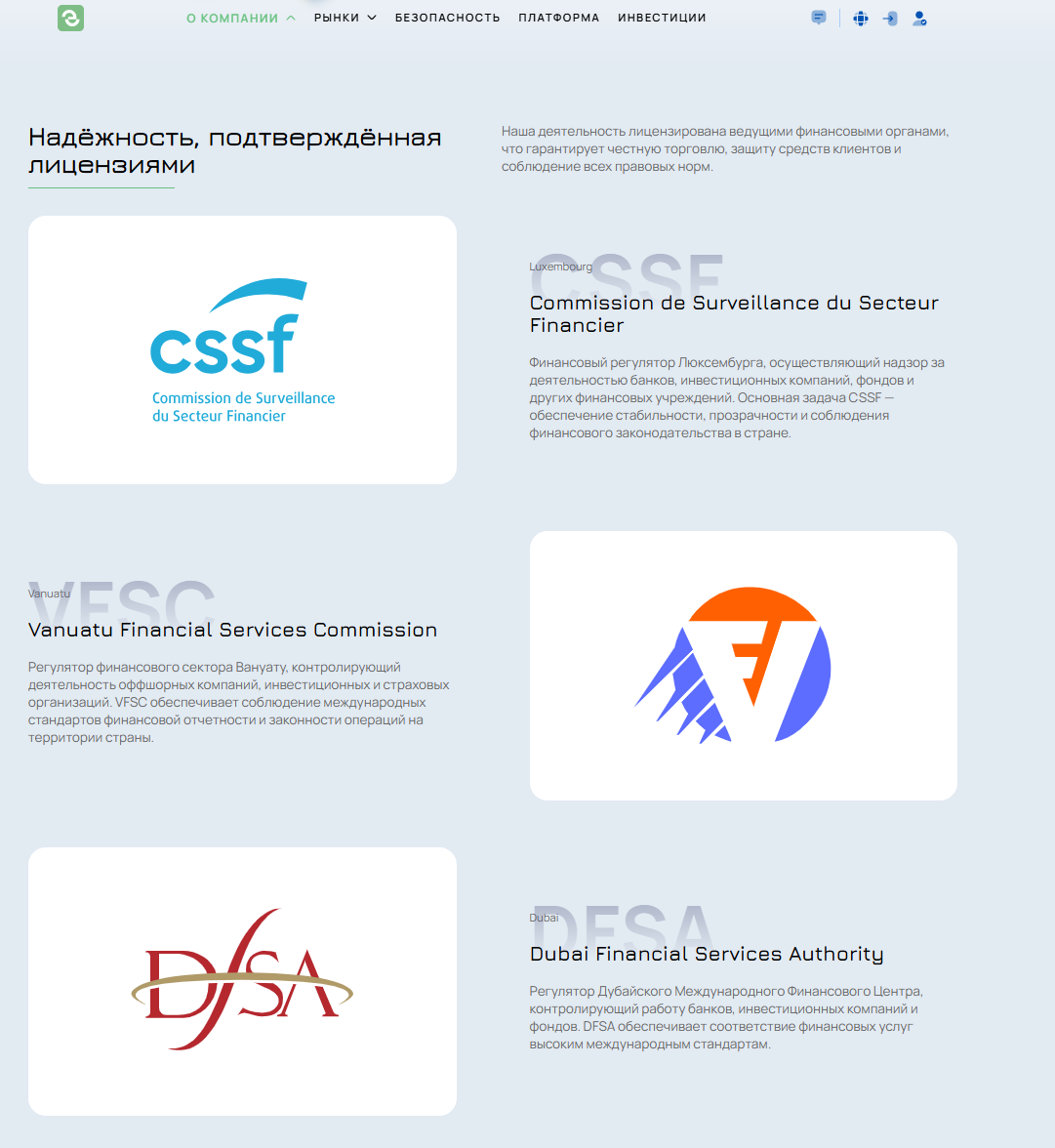 На сайте заявляется, что платформа лицензирована и регулируется различными органами. Упоминается наличие четырех международных лицензий. Есть ссылка на раздел с лицензиями, но названия регуляторов или скан-копии документов не предоставляются.