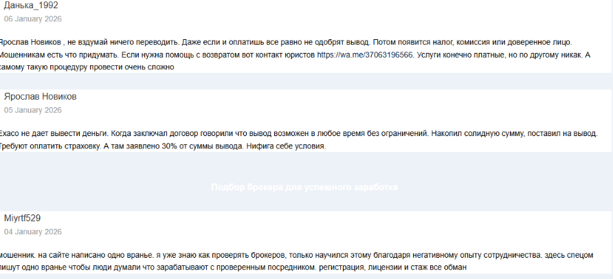 Отзывы о Exaco сосредоточены на обвинениях. После регистрации и пополнения счета платформа демонстрирует рост баланса за счет имитации успешной торговли. Однако при попытке вывести деньги возникают требования дополнительных платежей.