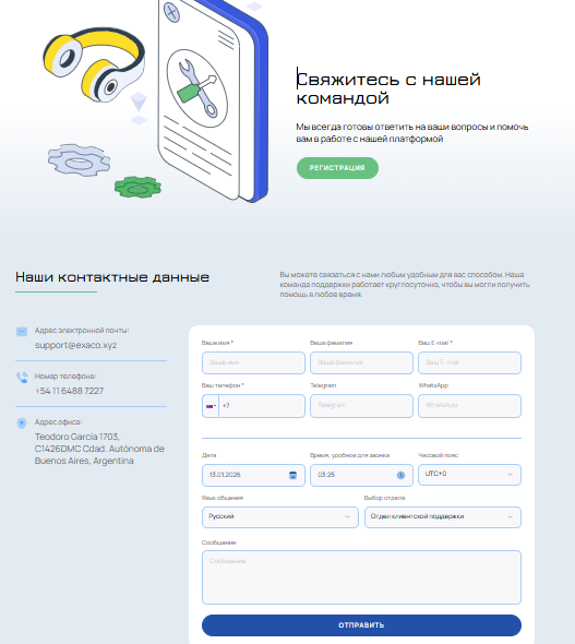 - электронную почту support exaco xyz в качестве основного канала поддержки;