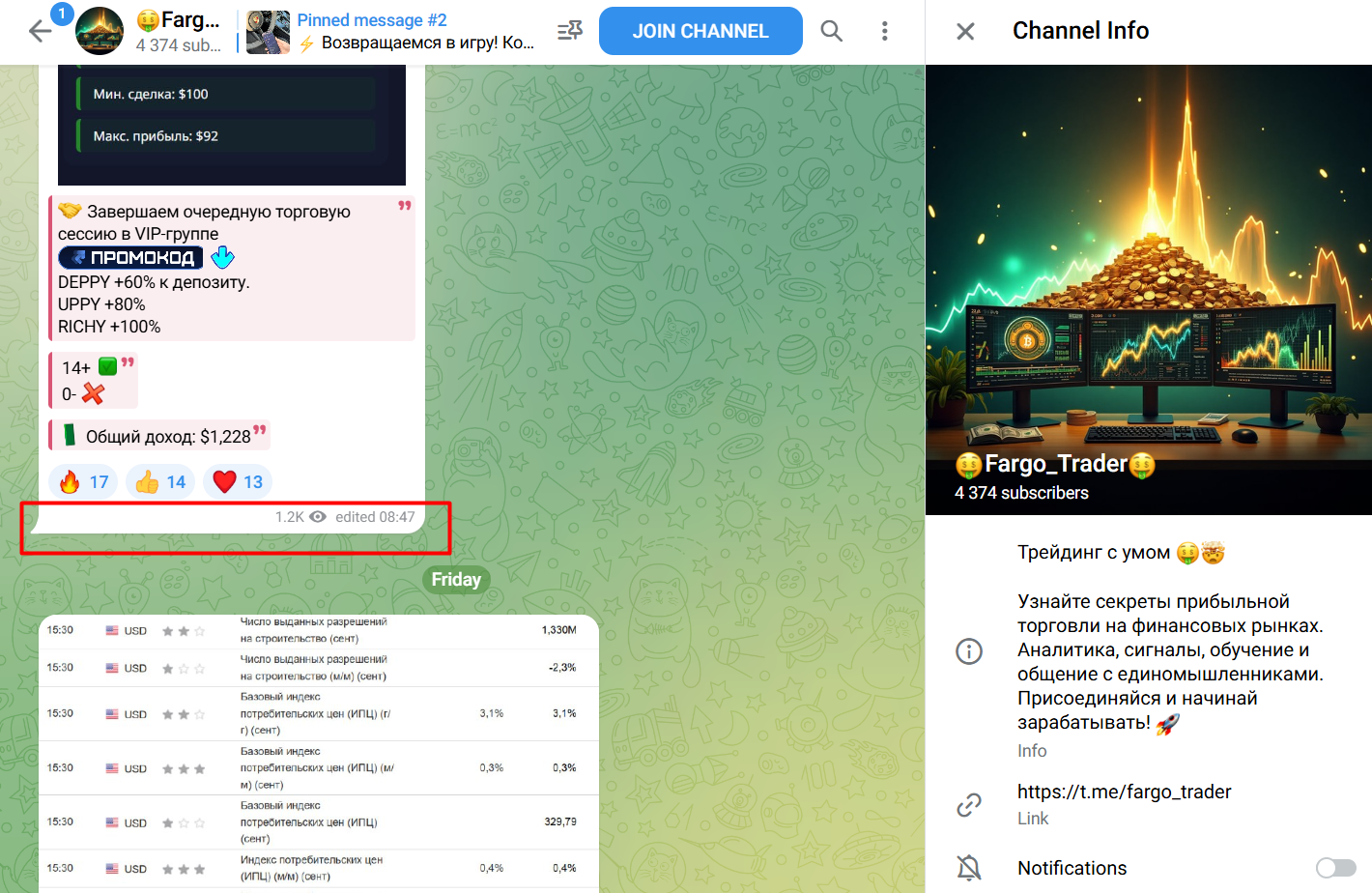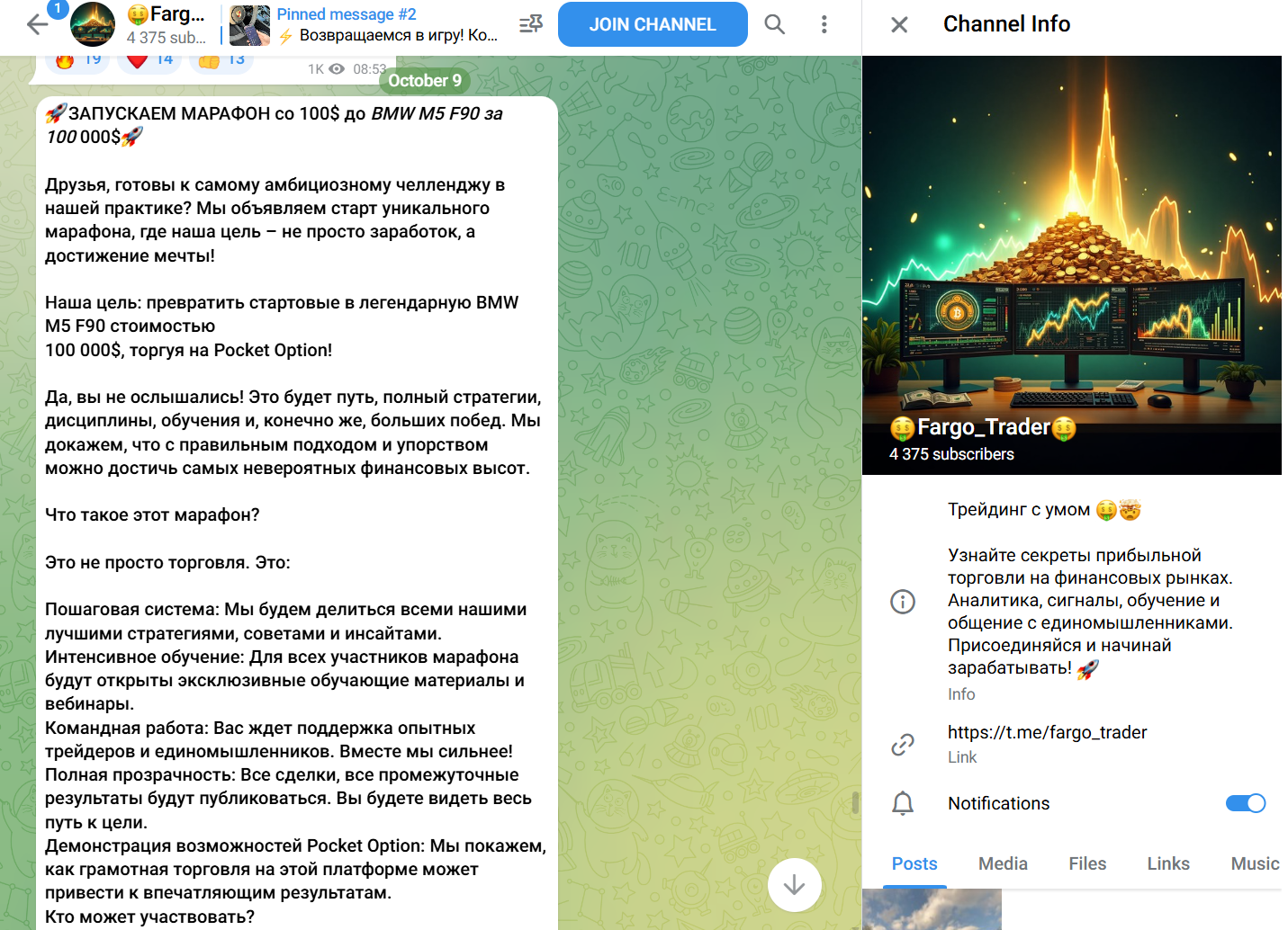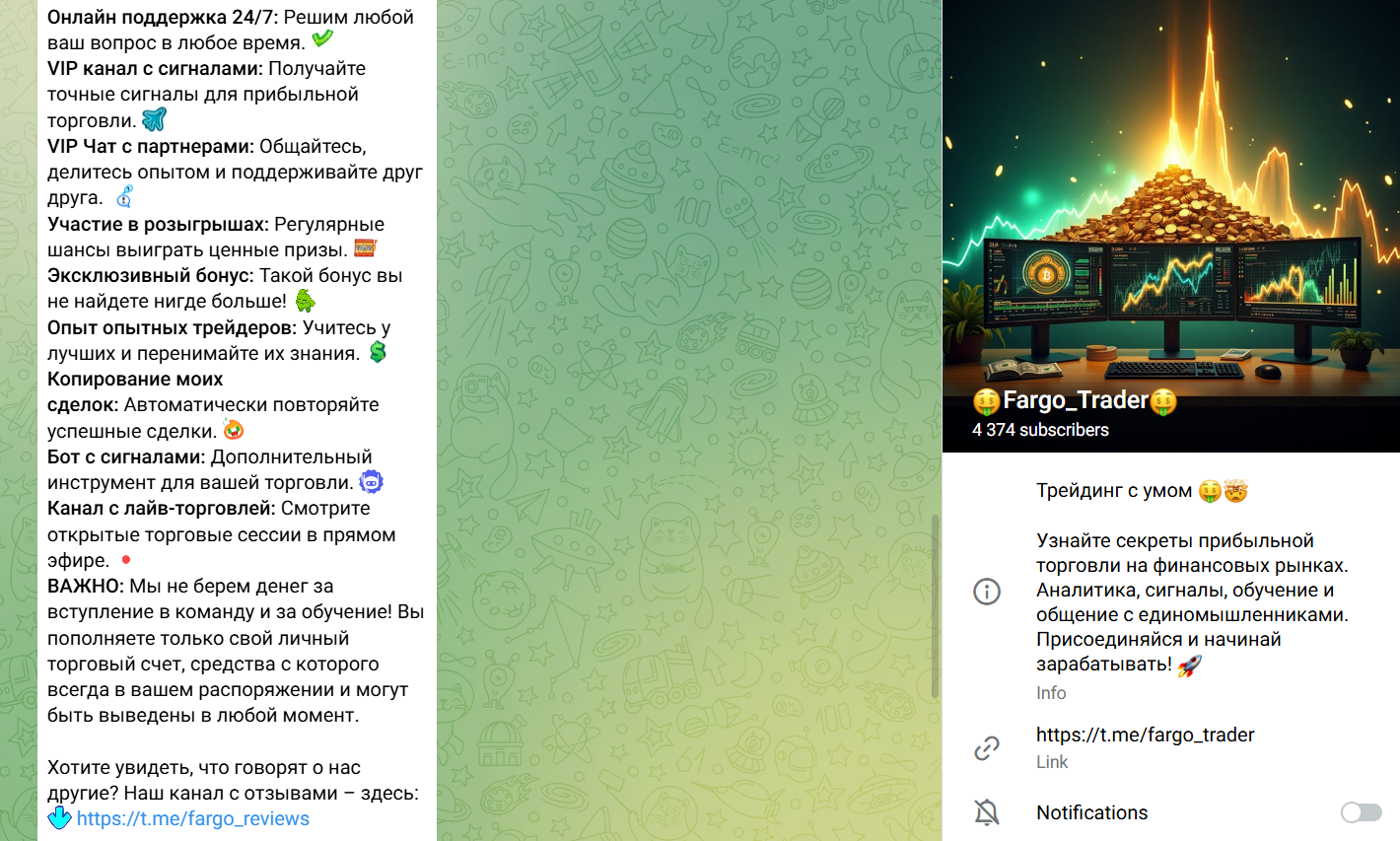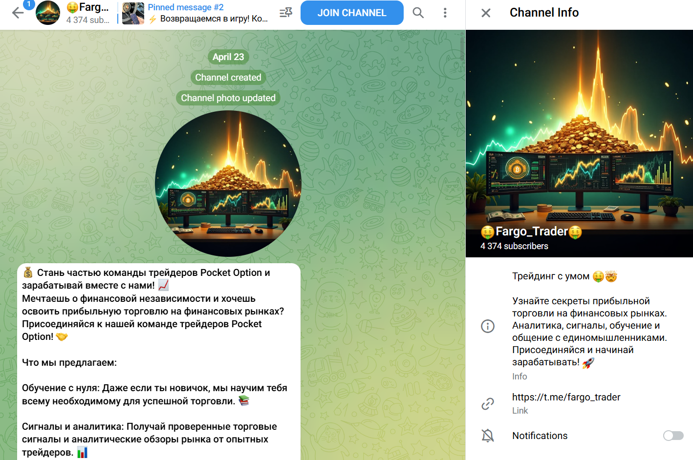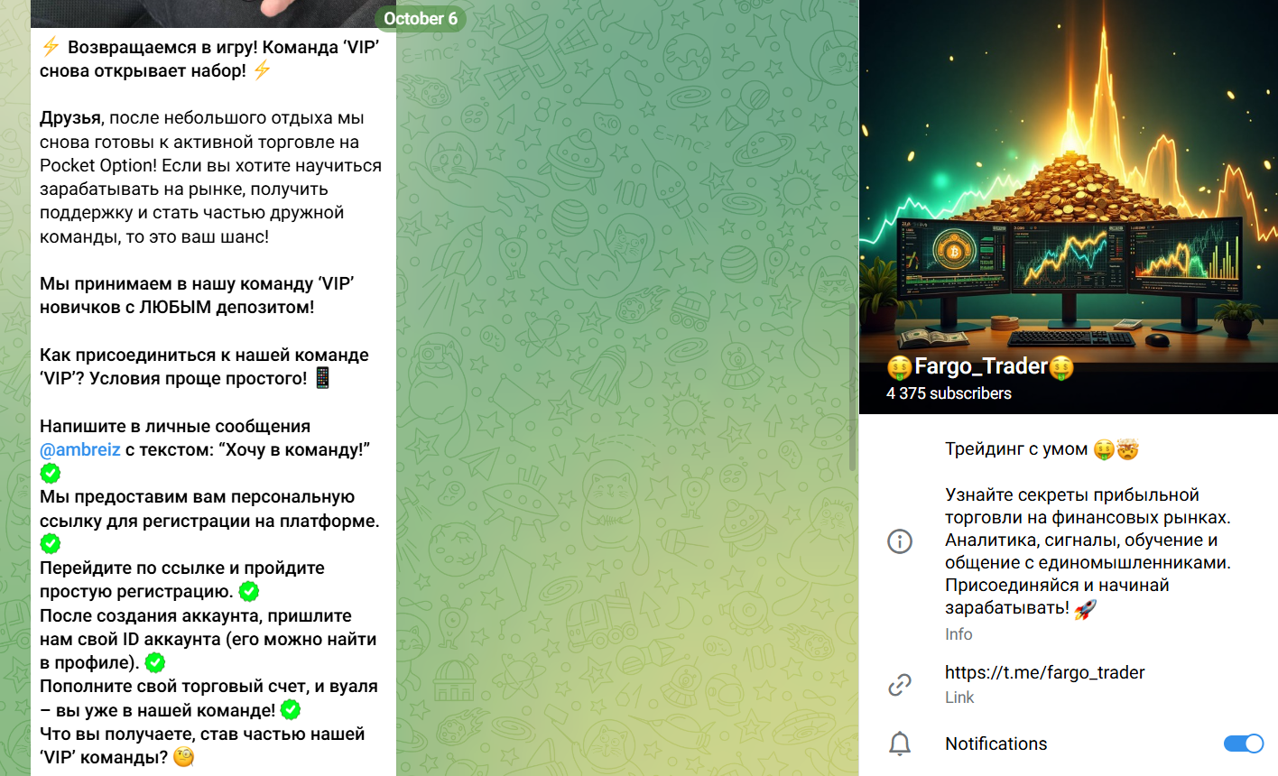 Fargo Trader — это очередной телеграм канал, где владелец торгует на крупной бирже бинарных опционов, Pocket Option, и привлекает туда свою аудиторию под предлогом добавления в приватный VIP канал с качественными сигналами. Однако сама платформа имеет сомнительную репутацию, а в сети много псевдо инвесторов, которые просто зарабатывают на реферальной ссылке. Можно ли доверять, узнаете в данной статье.