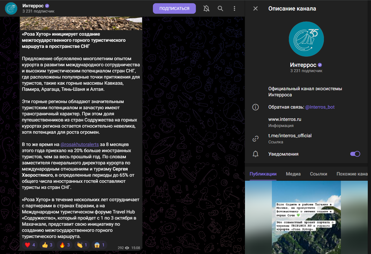 За неимением информации об интересующем направлении развития, проанализируем популярность самого учредителя проекта. Тот же телеграмм-канал «Интеррос» был зарегистрирован летом 2021 года.