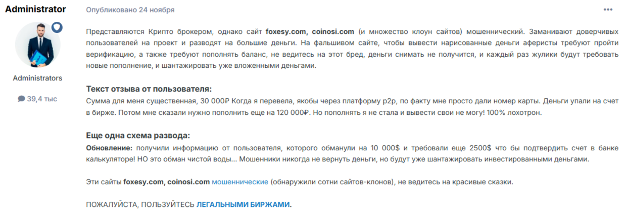 Биржа «Фохеси» – лучшее решение для избавления от своих сбережений. Мы не рекомендует трейдерам сомнительный проект. Планируете в плюс торговать криптовалютами – ищите информацию о надежных торговых площадках в наших обзорах.
