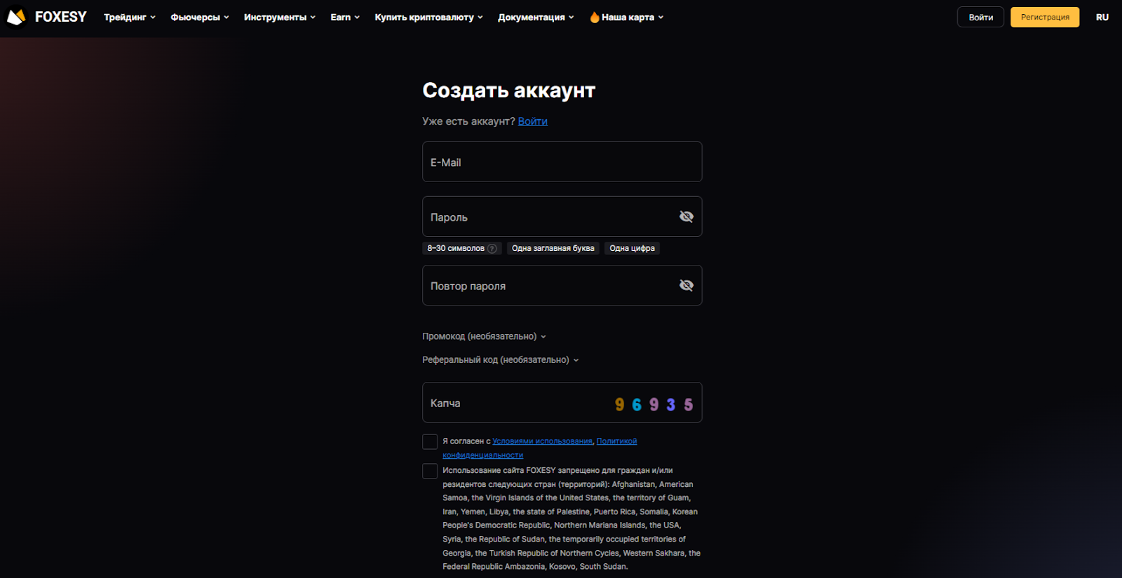 Воспользоваться всеми услугами криптовалютной биржи Foxesy могут только владельцы учетных записей. Для создания аккаунта следует активировать клавишу «Зарегистрироваться» или «Регистрация». После этого в специальную форму вносятся имейл, пароль, капча. Пользователь соглашается с условиями использования и политикой конфиденциальности. На завершающем этапе трейдер открывает личный кабинет, вносит депозит и приступает к торговле.