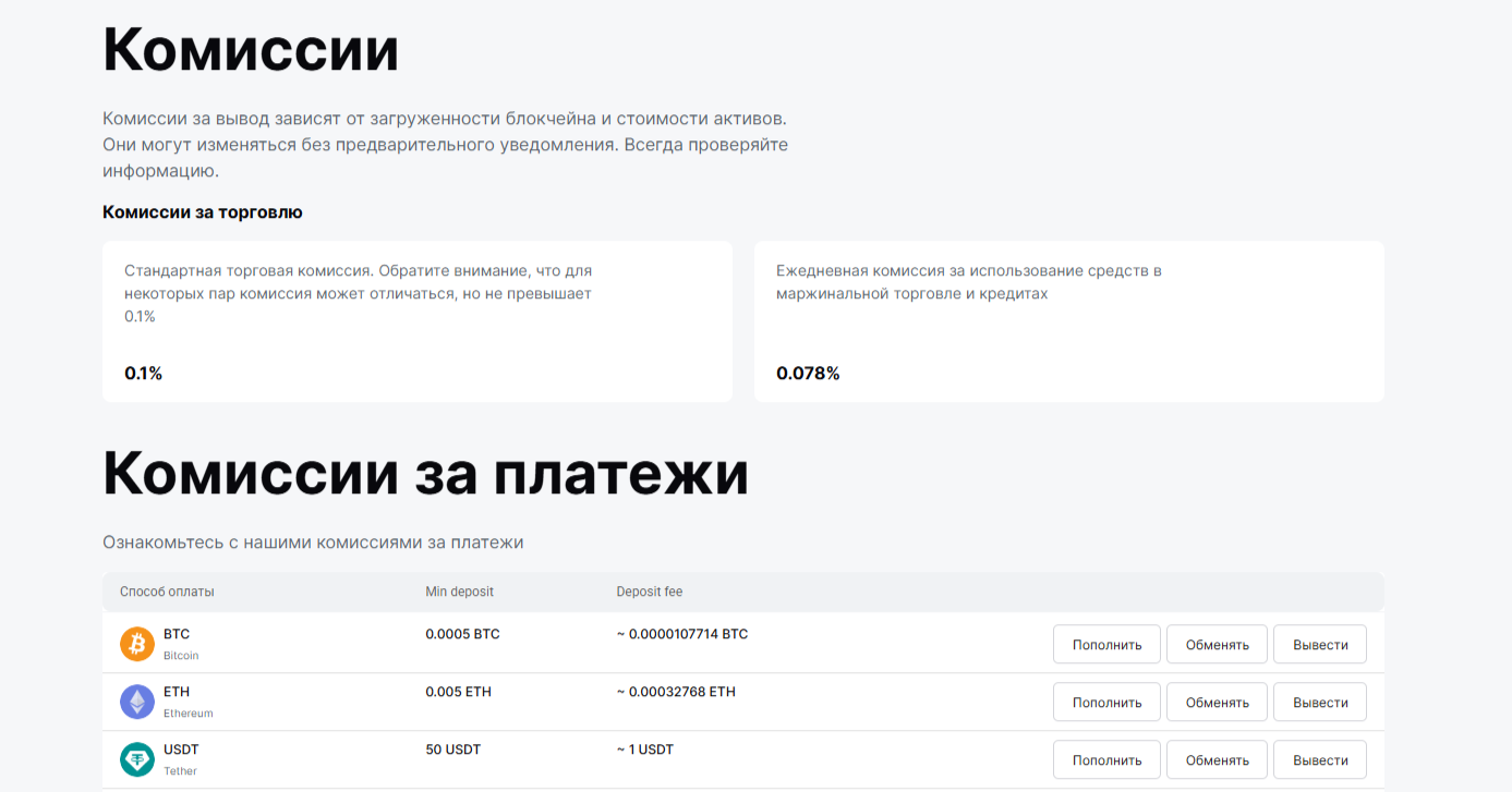 Финансовая сторона партнерских отношений с криптобиржей Foxesy упомянута в разделе «Сборы». Именно здесь можно найти информацию о торговых комиссиях в размере 0,1%, а также сборе за использование средств в маржинальной торговле и кредитах – 0,078%. Упомянутый раздел также знакомит читателей с комиссиями за платежи и минимальными депозитами.