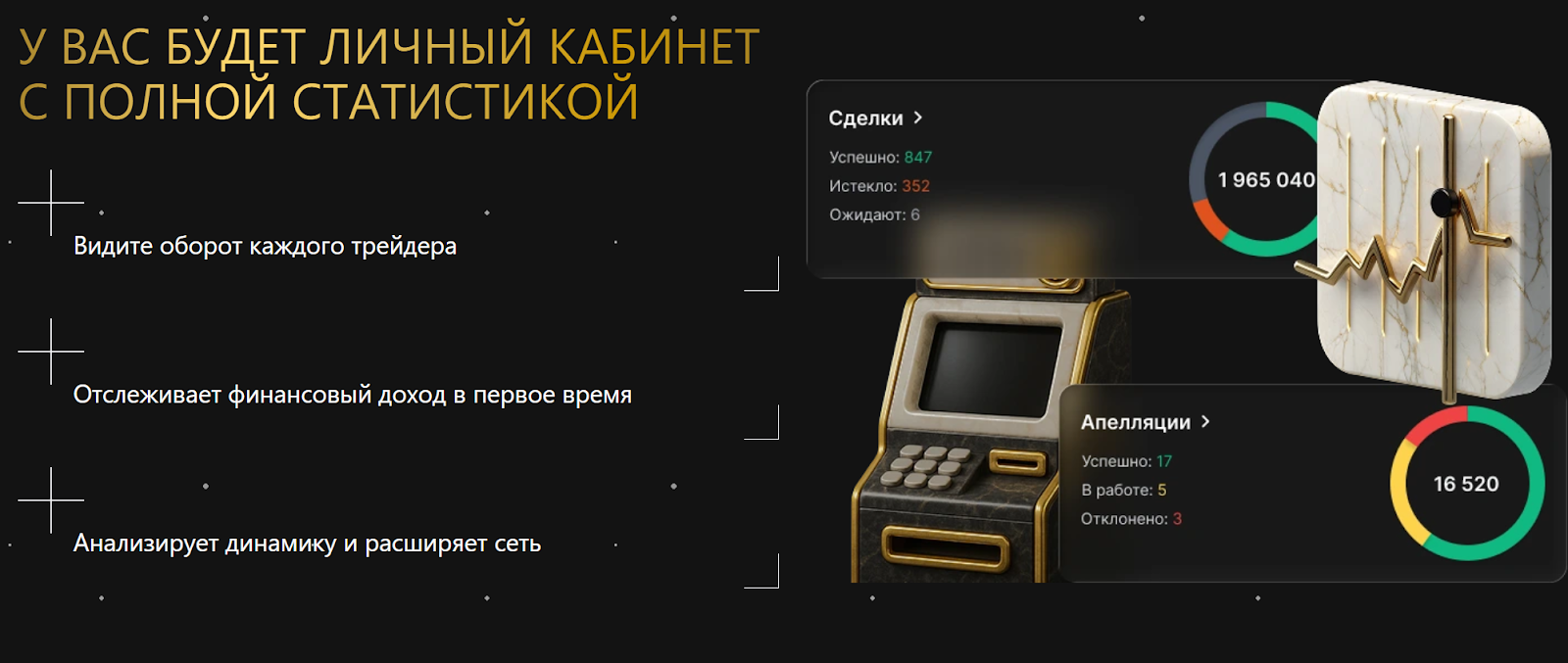 Судя по отзывам, площадка Go6 имеет весьма продуманный личный кабинет. Участник проекта видит оборот каждого пользователя и может контролировать прибыль. Есть возможность изучения динамики и расширения сети. В профиле можно увидеть число сделок и количество апелляций.