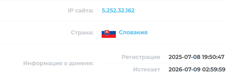 Рассматриваемый проект доступен по ссылке Go6 Online. После перехода пользователям доступен простой в оформлении и в некотором роде шаблонный официальный сайт. Проверка показала, что он создан только 8 июля 2025-го и продлен всего на год. Основной сервер находится на территории Словакии.