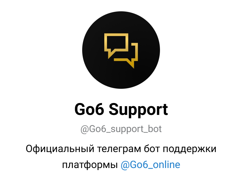 В футере приводится URL для связи с поддержкой. Помощь предоставляется через бота в Телеграмме по ссылке Go6 support bot. Клиентам обещают помочь со стартом сотрудничества и налаживанием работы. Другие контактные данные не доступны.