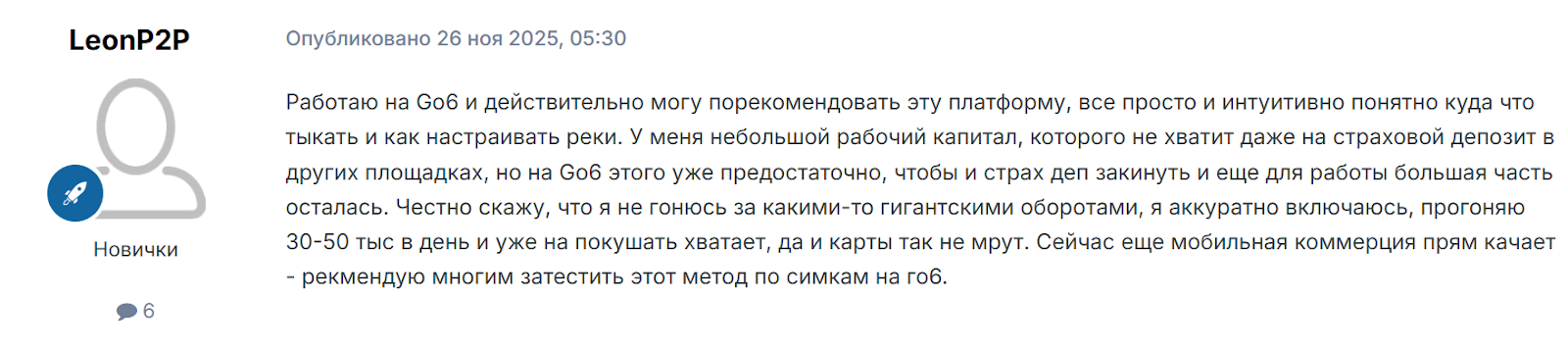 В отзывах о Go6 Online пользователи оставляют разные мнения о платформе. В позитивных мнениях выделяется интуитивность платформы, возможность старта с небольшим рабочим капиталом и хороший функционал.