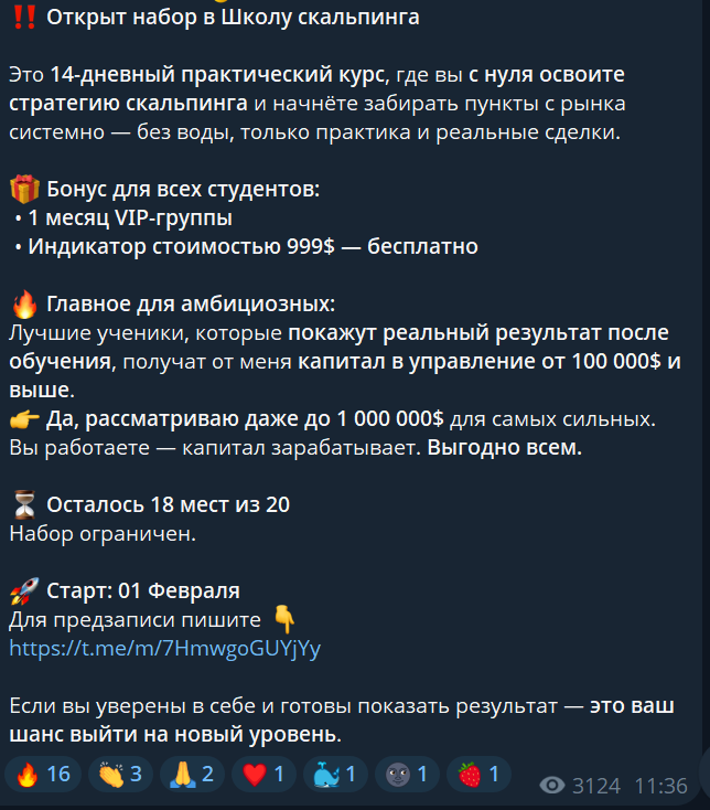 Основным направлением на канале становится не ежедневный бесплатный сигнал, а продвижение VIP-группы и обучения. В разные периоды автор публикует сообщения о наборе людей для обучения пользователей скальпингу. Сюда принимаются только решительно настроенные и амбициозные люди. После обучения они не только научатся применять прибыльные стратегии трейдинга на практике, но также смогут получить капитал в управление. Суммы для такой торговли якобы не ограничены и зависят от успехов обучения. Длительность курсов, стоимость и прочие параметры не указываются, так как все нужно уточнять в личных сообщениях.Чаще всего на канале «Скальпинг золота» появляется приглашение в VIP-группу. Оно публикуется раз в несколько дней. Там всегда ограниченное количество мест, которые традиционно скоро закончатся, но на практике успевают записаться все бесплатно. Стоимость вступления вне таких акций никогда не указывалась. Такой подход выглядит подозрительно, так как имеет признаки манипуляции и его нередко применяют мошенники. Здесь обещают больше сигналов в день. На канале постоянно публикуются отчеты по отработкам, что также нацелено на привлечение новых пользователей в группу.