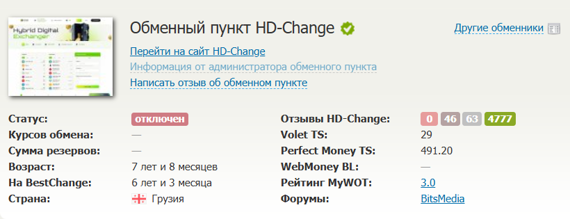 Но одна из ссылок ведет на нерабочий сайт.. Вторая направляет на главную страницу, не связанную с Hd Change Com, а третьем агрегаторе обменник почему имеет статус «Отключен», что вызывает подозрение в прозрачности работы обменной площадки.