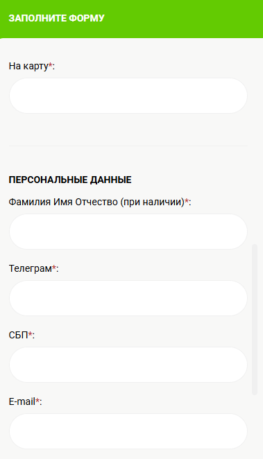 После выбора вида токенов и суммы необходимо ввести в форму реквизиты счета, ФИО, тг-аккаунт, номер для СБП и электронную почту. На последнем этапе необходимо перечислить средства на появившийся адрес кошелька и ожидать поступления фиата.