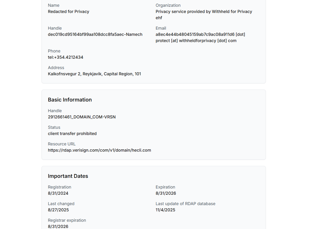 Сервис появился в сети в конце августа 2024 года, домен зарегистрирован через зарубежного регистратора NameCheap, а данные владельца скрыты услугой приватности. На главной странице Hecli com указаны курсы BTC, ETH, LTC, TRX, DOGE, DASH, XRP и SOL, но подписи не всегда совпадают с рыночными котировками.
