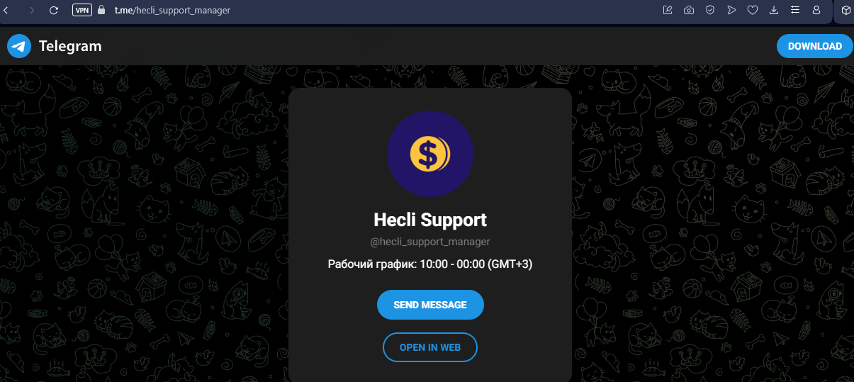 - Поддержка Hecli com работает только через телеграмм-канал, а круглосуточного обслуживания клиентов нет. Из этого следует, что если возникнет срочный вопрос, оперативного решения ждать неоткуда.