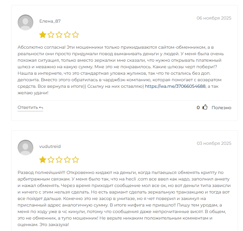 При этом вне площадки Hecli com встречаются отзывы, где пишут про «скам», «лохотрон», «развод» или «обман». В профильных чатах и на форумах есть истории о зависших переводах, запросах на повторную оплату и игнорировании саппорт-менеджера. Также указывают, что курсы могут значительно отличаться от рыночных в убыток клиенту, поэтому использовать проект для арбитража не целесообразно.
