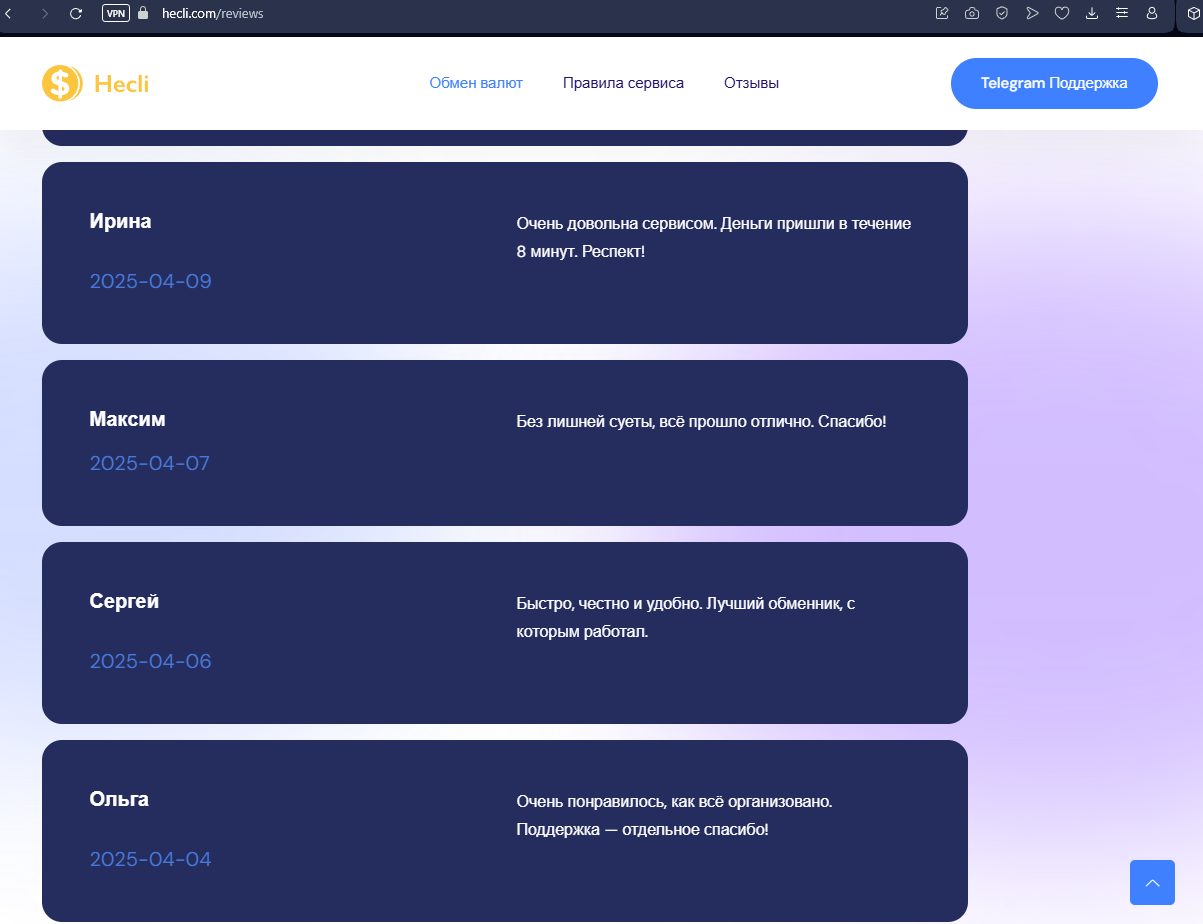 Среди плюсов стоит отметить простую заявку, моментальное создание ордера и возможность быстро обменять небольшую сумму. Из дополнительных удобств — поддержка через телеграмм-канал Hecli Support Manager, куда можно обращаться с 10 утра до полуночи.