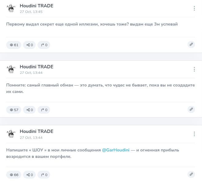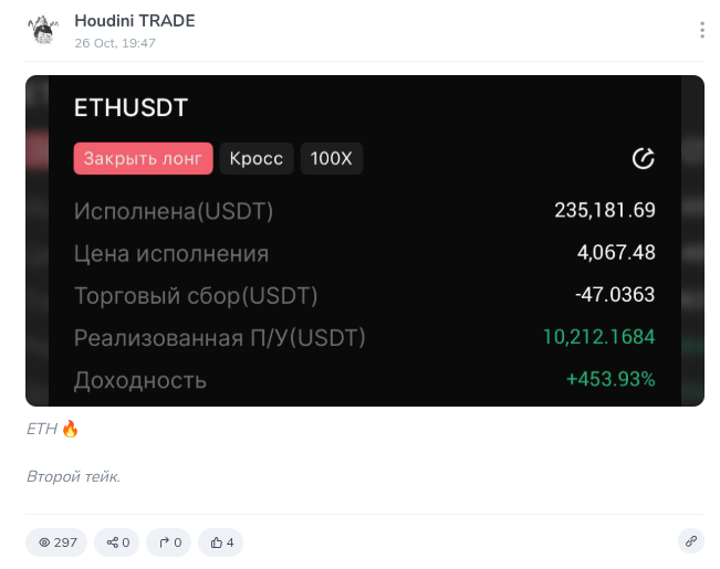 Канал Houdini Trade – очередная попытка упаковать бестолковый сигнальный проект в эффектную легенду о трейдере-иллюзионисте. Обещания в духе «410% профита», VIP-чаты и реферальные ссылки на биржу – привычное дело для инфоцыган и скамеров.