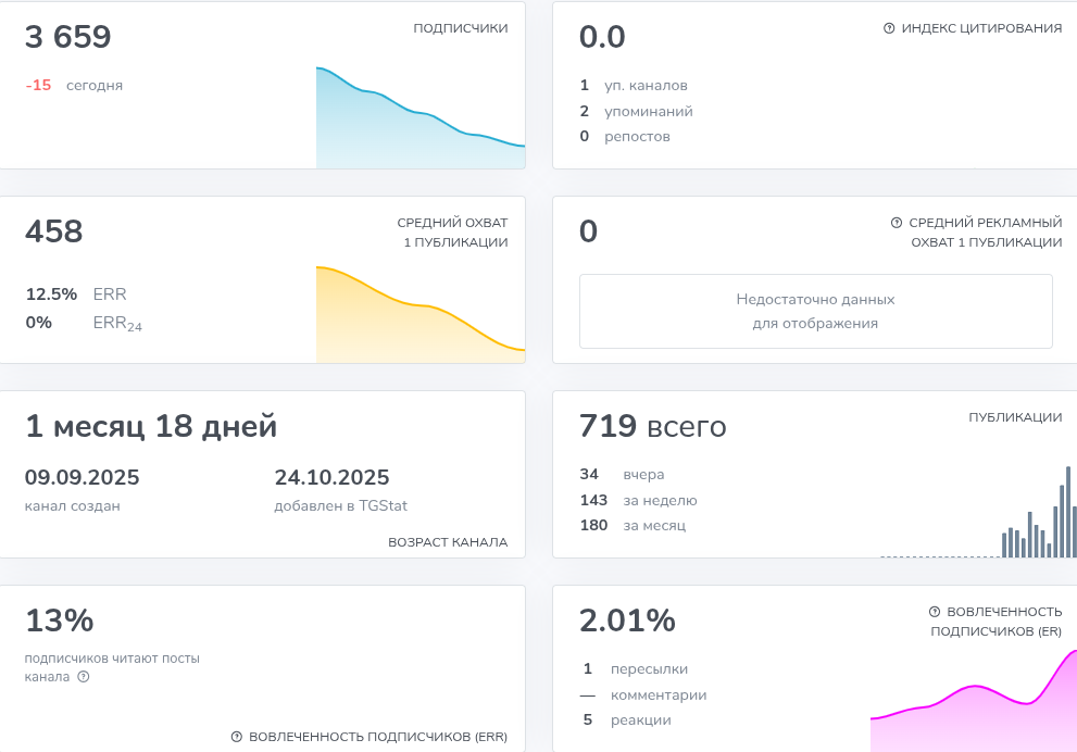 Канал Houdini Trade создан 9 сентября 2025 года и за полтора месяца собрал около 3 600 фолловеров. Согласно данным агрегатора TGStat, охваты одного поста держатся на уровне ~450 просмотров, вовлеченность низкая (около 2 %). Аудитория растет нестабильно, и вполне очевидно, что админ использует серые методы раскрутки – за счет ботов и фейковых аккаунтов.
