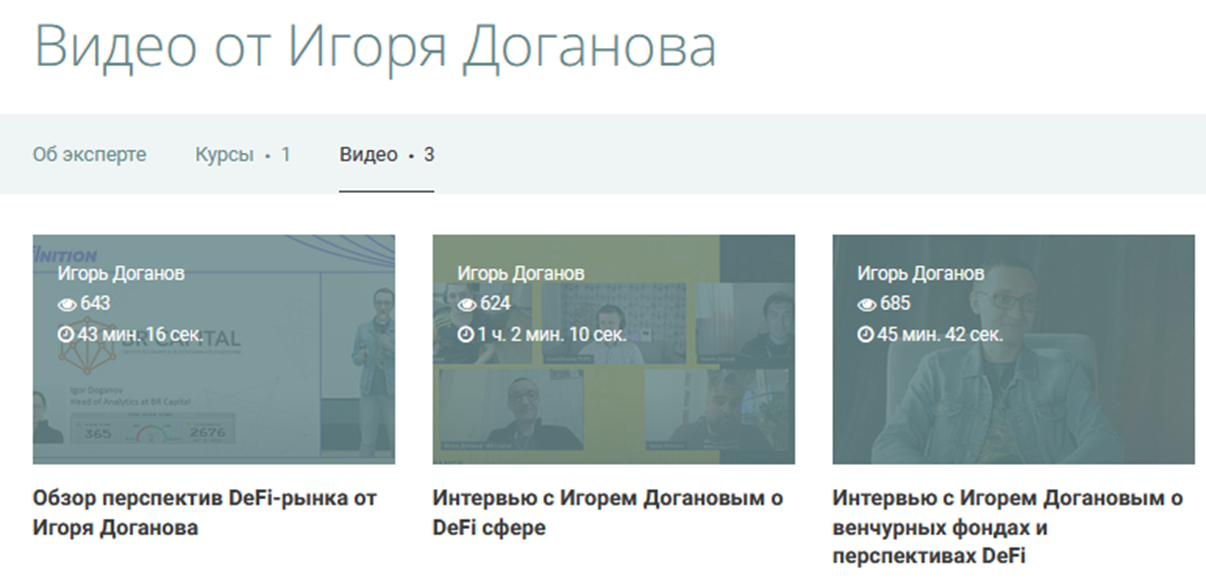 Игорь имеет собственный профиль на крупных образовательных платформах. Предлагает слушателям бесплатный доступ к интенсивам, обзорам рынка DeFi, интервью.