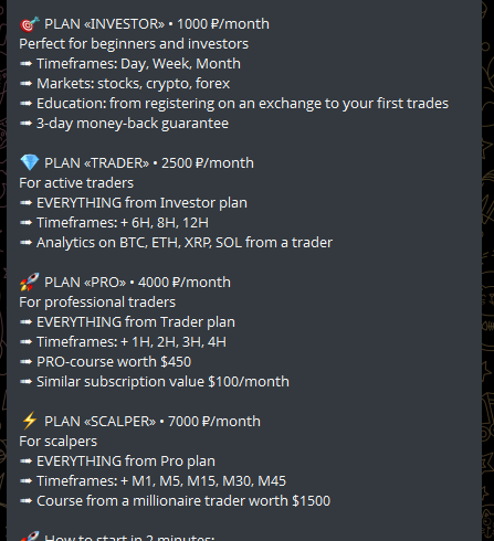 - наличие 4-х тарифов для пользователей с разным опытом (Инвестор, Трейдер, Про, Скальпер);