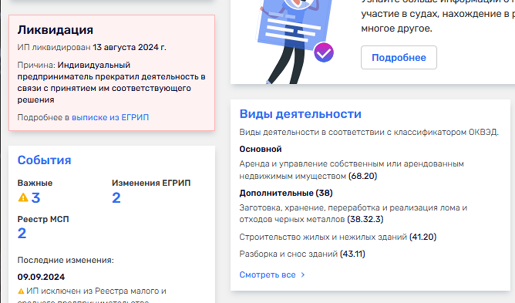 Но при проверке выясняется, что ИП Карагодин ликвидирован в 2024 году. То есть указанные юридические данные уже не соответствуют действительности. Также при анализе видно, что среди заявленных видов деятельности – управление недвижимостью, строительство, хранение и заготовка лома. Об информационных технологиях упоминания нет. Это должно насторожить потенциальных пользователей программы, так как о профильном образовании и опыте в трейдинге разработчика ничего не известно.