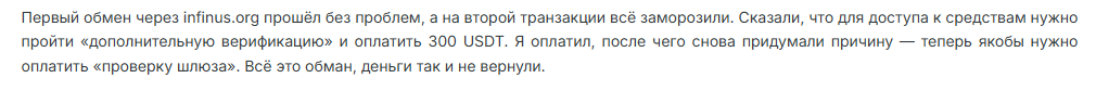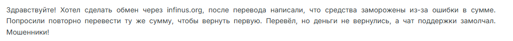 Другой клиент компании рассказывает о блокировке доступа – при попытке обмена система выдала ошибку из-за якобы неправильно указанной суммы. Техподдержка убедила оформить еще один перевод, но даже после этого деньги не поступили на указанный кошелек.Некоторым все-таки удалось успешно воспользоваться обменником Infinus, но только при первых транзакциях. Далее система начинала требовать дополнительные платежи – сначала все та же платная верификация, потом проверка шлюза и пр.