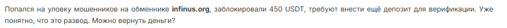 - отсутствие контактных данных обменника Infinus org в открытых источниках не позволяет обратиться к саппорту с интересующими вопросами.