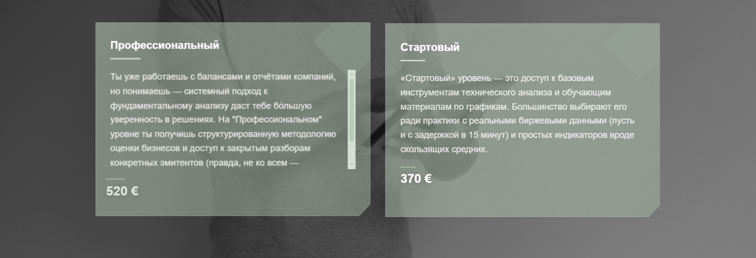Цена на обучение для жителей России достаточно высокая. Непонятно почему создатели принимают для оплаты зарубежную валюту, если целевая аудитория однозначно жители РФ. Об этом говорит язык, на котором написан весь текст, а также примеры / кейсы учеников, ведь по словам разработчиков клиенты из Москвы / Санкт-Петербурга / других городов. Вдобавок ценность курсов оценить сложно, людям предлагают непонятные материалы по оценке бизнеса / использованию индикаторов на практике, которых полным полно в интернете бесплатно.