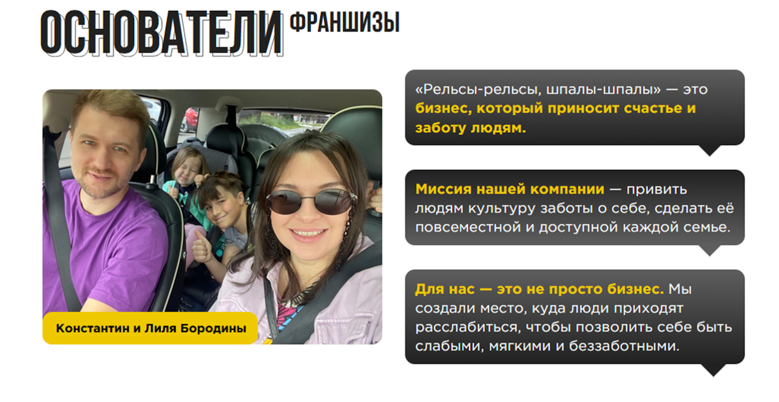 - заявления о владении сетью СПА-салонов в Казани под названием Рельса не соответствуют действительности (владельцами франшизы является семейная пара Бородиных);