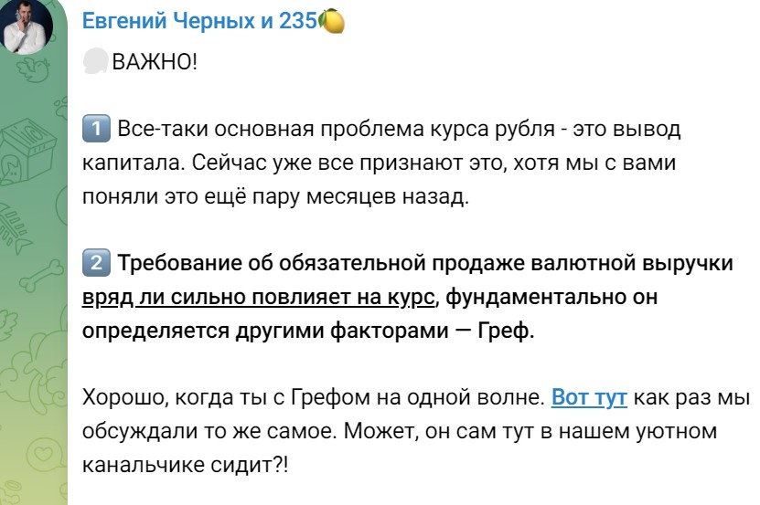 Спорные утверждения — конек Евгения. Оказывается, в 2022-2024 годах проблема курса рубля — вывод капитала за границу. Хорошо, что Евгений и Греф на одной волне. Правда, к реальности это не имеет никакого отношения.