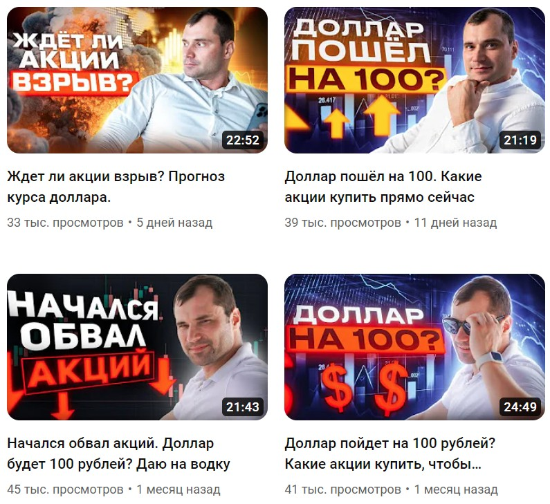 Правильнее назвать Евгения блогером. На Youtube он рассказывает о базовых событиях рынка. Специализируется на российских ценных бумагах. Интересно, что дает он разные прогнозы, в том числе самые странные. Вот ролики 2024 года. Обсуждение доллара, падение акций, обвалы — все кликбейт, не имеющий отношения к аналитике.