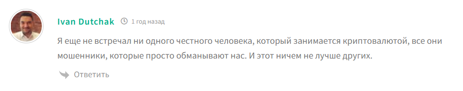 В еще одном негативном отзыве клиент пишет, что еще не встречал честного инвестора по криптовалюте. Он говорит, что все обманывают новичков в трейдинге.