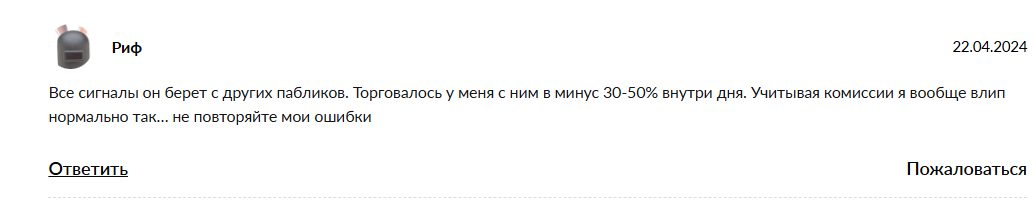 Пользователи не отзываются о Павле в положительном ключе. Например, один из клиентов в отрицательном отзыве о «Крипте с нуля» пишет, что слил деньги и интересуется поиском нормальных и профессиональных гуру.Еще один трейдер говорит, что торговал с этим каналом в минус, так как автор собирает информацию с других профилей. В результате он потерял деньги и не рекомендует никому связываться с Елисеевым.