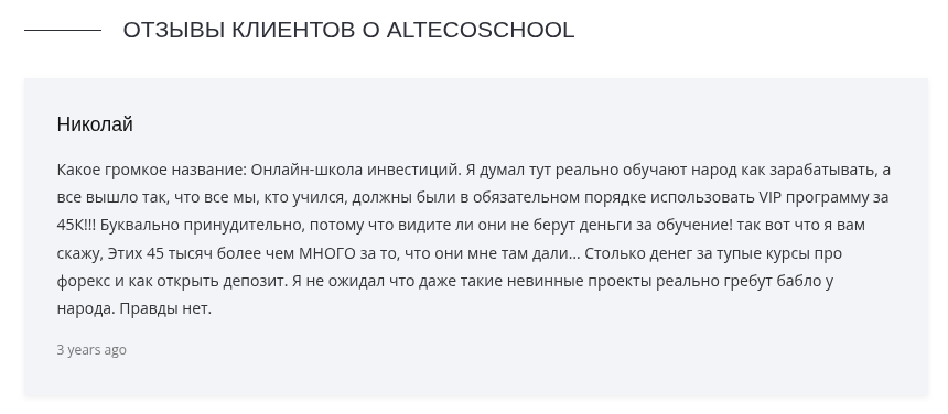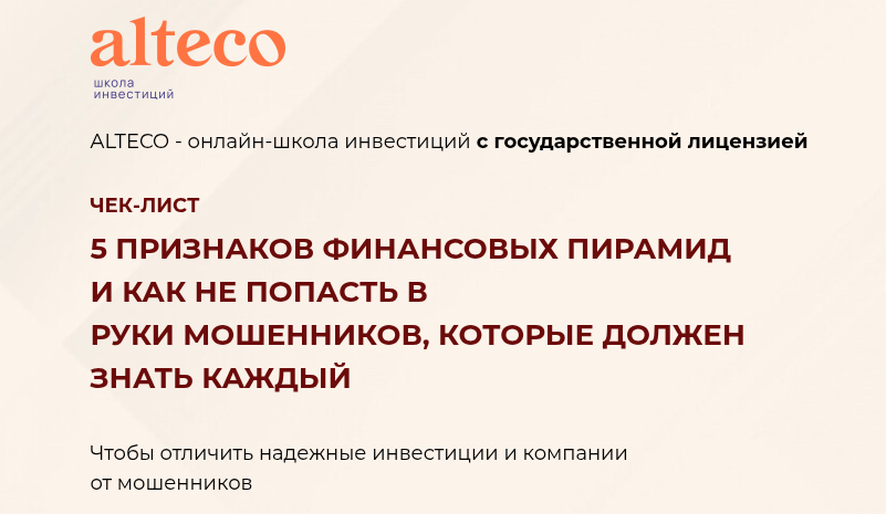 Иронично, что среди бесплатных материалов есть чек-лист «Alteco: 5 признаков финансовых пирамид и как не попасть в руки мошенников». При этом сама школа использует методы, схожие с хайп-проектами – обещания сверхдоходности и давление на эмоции.