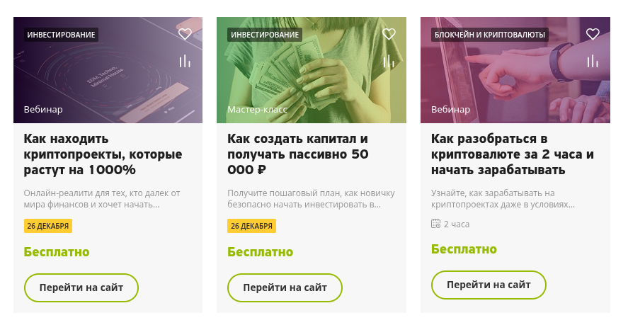 • Вебинар «Как находить криптопроекты, которые растут на 1000%». Обещание найти гемы с доходностью в 10 иксов для новичков – это чистой воды популизм. Такие риски обычно граничат с казино, но авторы подают это как системный навык.