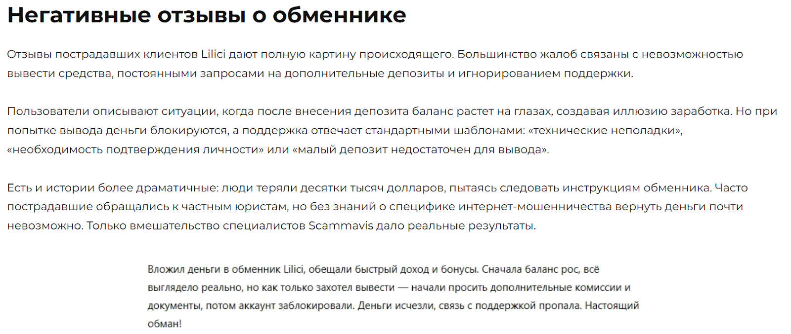 Отзывы на сайте Lilici выглядят шаблонными и лишены конкретики. Все они исключительно положительные. Требование «личного идентификатора» для публикации отзыва является способом ограничить их написание только лояльными клиентам или даже подделать их.