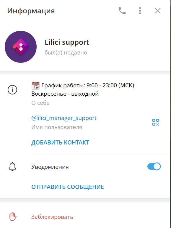 Техническая поддержка Lilici работает в режиме 24/7. Основной канал связи – Telegram через аккаунт @LiliciManager. Пользователям предлагается обращаться для решения вопросов с обменом валют, ошибками в транзакциях или дополнительной верификацией. В пользовательском соглашении указано, что время ответа может составлять до 24 часов. Это уже противоречит заявлениям о мгновенной помощи. Отсутствие отзывов о поддержке на независимых платформах усиливает подозрения.