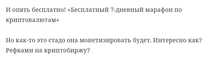Студентов ждет практика под присмотром опытных специалистов. Биржа, на которой будут проводить сделки участники марафона – Bybit. В рамках курса предполагается первая покупка криптовалюты. Из данного оффера можно сделать вывод, что участников собирают в качестве рефералов, а бесплатный марафон и и обучение (по факту – базовая информация из открытых источников) являются наживкой для регистрации пользователей. Заметим, что Bybit вытягивает деньги из новых клиентов как раз через различных мутных партнеров, задача которых – затягивать рефералов, представляясь опытными экспертами.