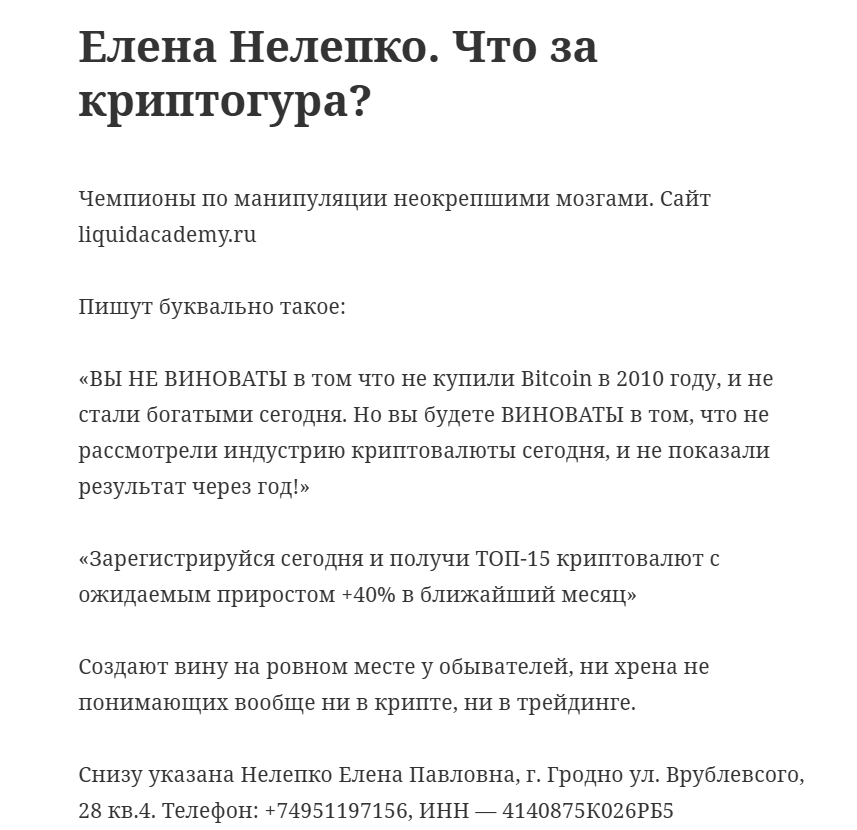 Обучение работе с криптовалютой в рамках марафона Liquid academy – это попытка нажиться на доверчивости пользователей, замылив им глаза успешностью развития крипто индустрии. Бесплатное обучение будет проходить на мутной торговой площадке с реальными инвестициями из личных средств клиентов. Завершится сотрудничество просадкой счета реферала. Пользователь несомненно получит урок после работы с порталом — только не такой, на которого он рассчитывал связываясь с платформой.