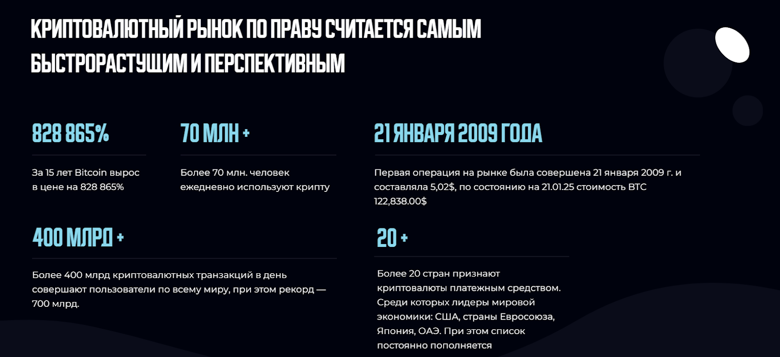 На сайте опубликована общая информация про крипто рынок. Обзор успеха биткоина и акцент на популярности криптовалюты делает площадку похожей на новостник. На данном этапе презентации прячется хитрый ход – завлечь пользователей в воронку, при этом старательно не упоминая о высокой волатильности рынка и рисках крипто инвестиций.